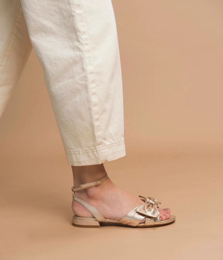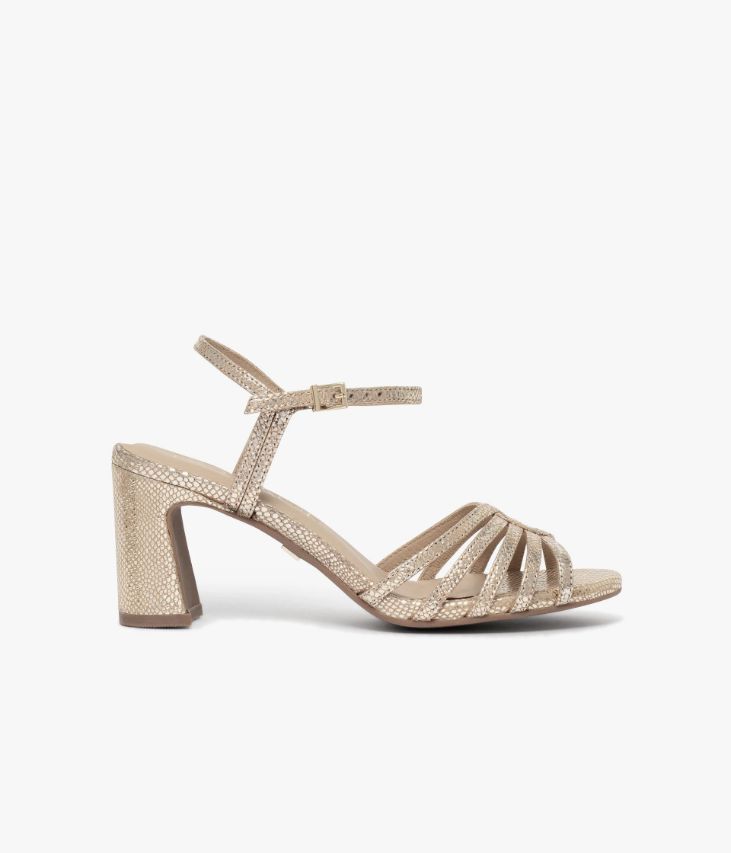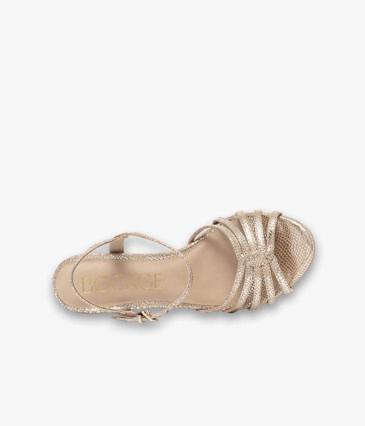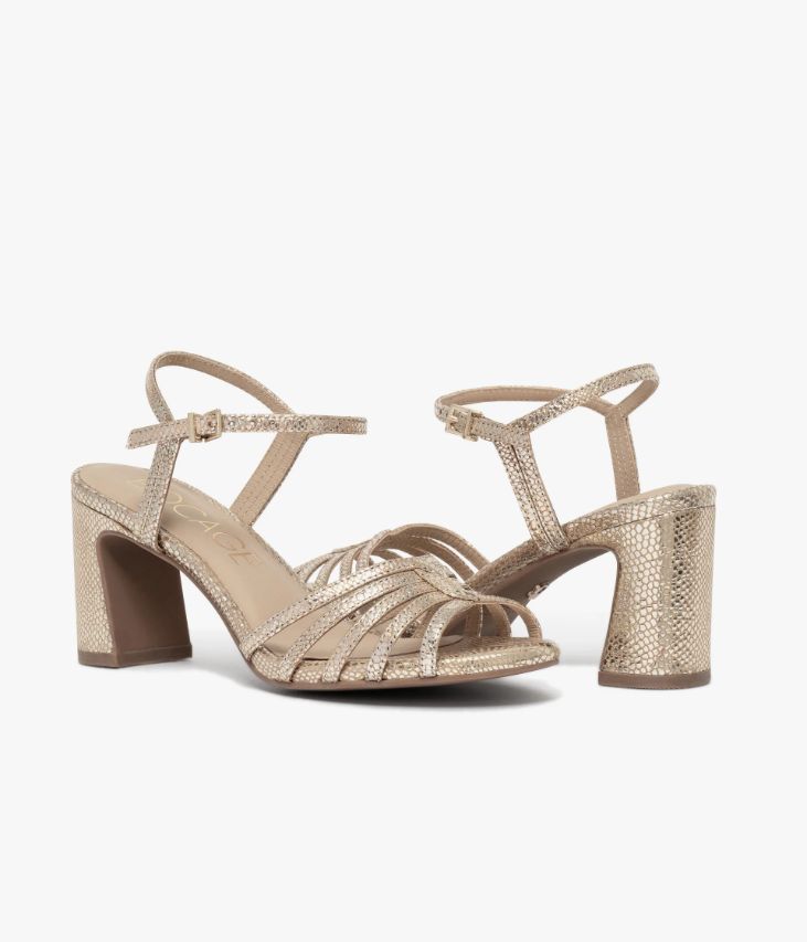 Une sandale en cuir métallisé doré façon lézard fabriquée avec le plus grand soin. Ce modèle chic et confortable enveloppe le pied de délicates brides et se ferme à l’aide d’une fine boucle carrée sur la bride cheville. Une chaussure scintillante entièrement doublée cuir avec semelle intérieure cuir dotée d’une fine mousse. Elle est posée sur une semelle souple et un talon à gorge enrobé de cuir. Notre technologie Bocage Innovation vous garantit un bien-être inégalé. La semelle dissimule des élastiques qui permettent à votre chaussure de s’adapter à votre pied.