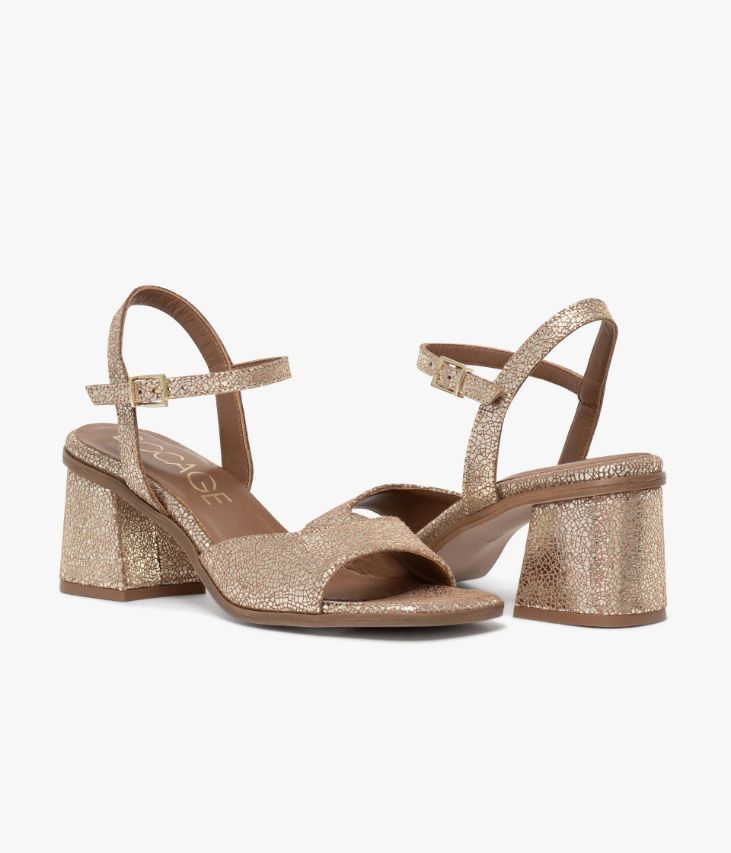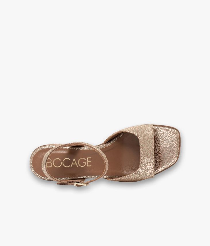 Une sandale platine en cuir métallisé effet craquelé fabriquée avec le plus grand soin. Une chaussure largement ouverte dotée d’une bride au design graphique avec large décolleté convenant aux cous-de-pied forts et d’une fine bride autour du talon fermée par une boucle dorée. Elle repose sur une semelle fine à bout carré et un large talon flare enrobé positionné en retrait qui lui confèrent une allure rétro. Une chaussure entièrement doublée cuir avec semelle intérieure cuir dotée d’une fine mousse.