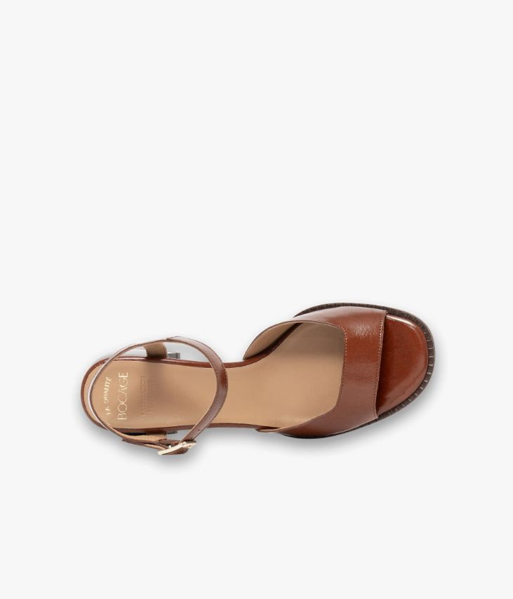 Une sandale en cuir cognac fabriquée avec soin dans notre propre atelier en France, au cœur du Maine et Loire (49). Une sandale au style vintage fortement inspiré du vestiaire des années 70 avec sa découpe atypique sur le dessus, sa trépointe débordante et son talon flare bombé. Son cuir vintage est un cuir d'aspect vieilli qui se patine avec le temps, un cuir brillant qui affiche un aspect plus ou moins froissé, dont la tonalité peut varier, et qui peut avoir un aspect "déjà porté". Elle tient parfaitement au pied grâce à une bride autour de la cheville fermée par une boucle dorée. Une sandale entièrement doublée cuir avec semelle intérieure cuir dotée d’une fine mousse.