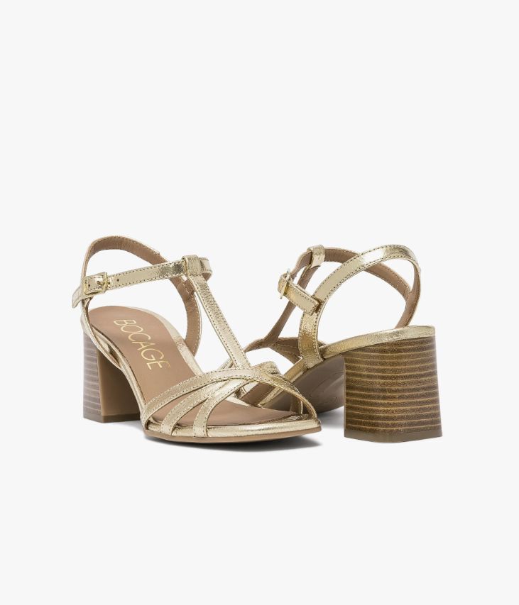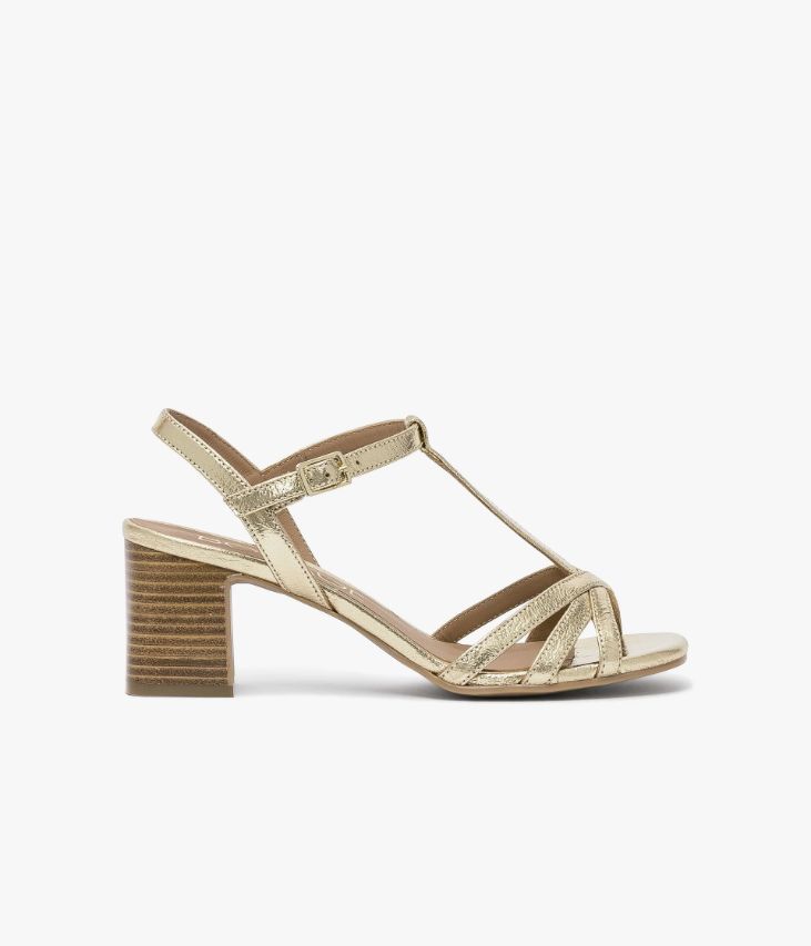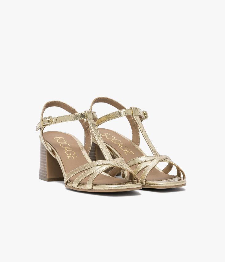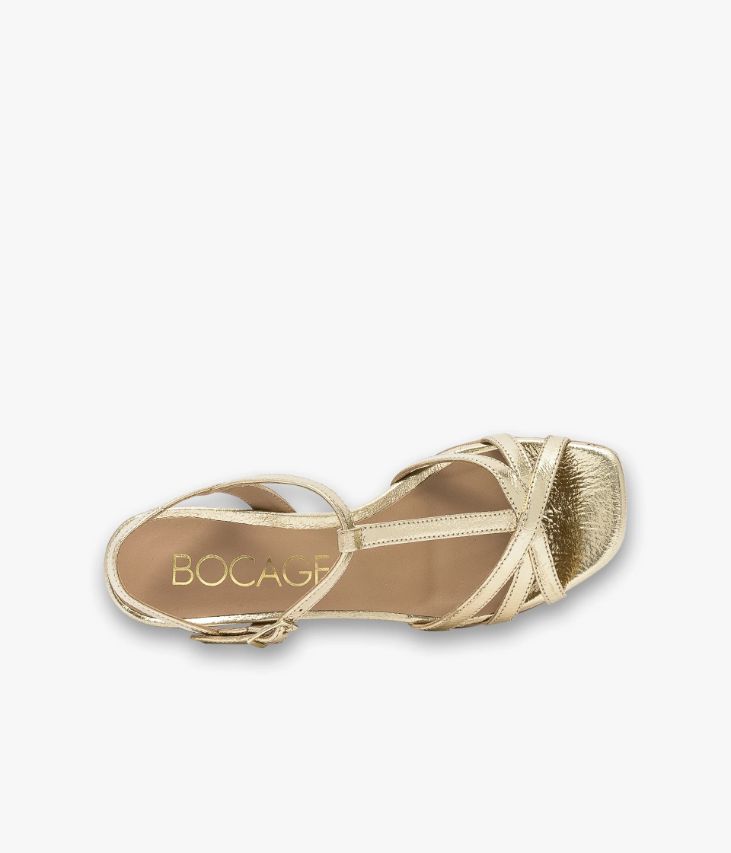 Une sandale dorée en cuir métallisé fabriquée avec le plus grand soin. Sa forme Salomé à fines brides sublime le pied et offre un parfait maintien. Cette sandale se ferme par une boucle dorée rectangle sur le côté dissimulant un élastique. Doublée cuir avec semelle intérieure cuir dotée d’une fine mousse, elle repose sur une semelle souple à bout carré et un talon confortable.