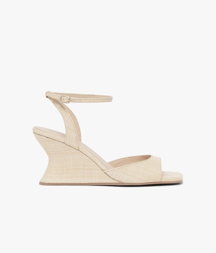 Une sandale beige aspect raphia fabriquée avec le plus grand soin. Un modèle résolument tendance aux influences rétro avec une semelle à bout carré, un large décolleté rond et une fine bride autour de la cheville fermée par une délicate boucle dorée. Cette sandale femme repose semelle fine avec talon compensé au design graphique au look singulier. Une chaussure doublée cuir avec semelle intérieure cuir dotée d’une fine mousse.