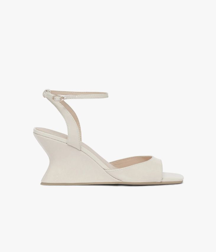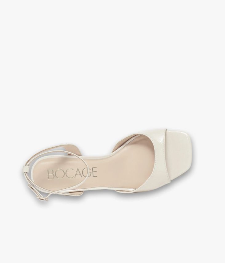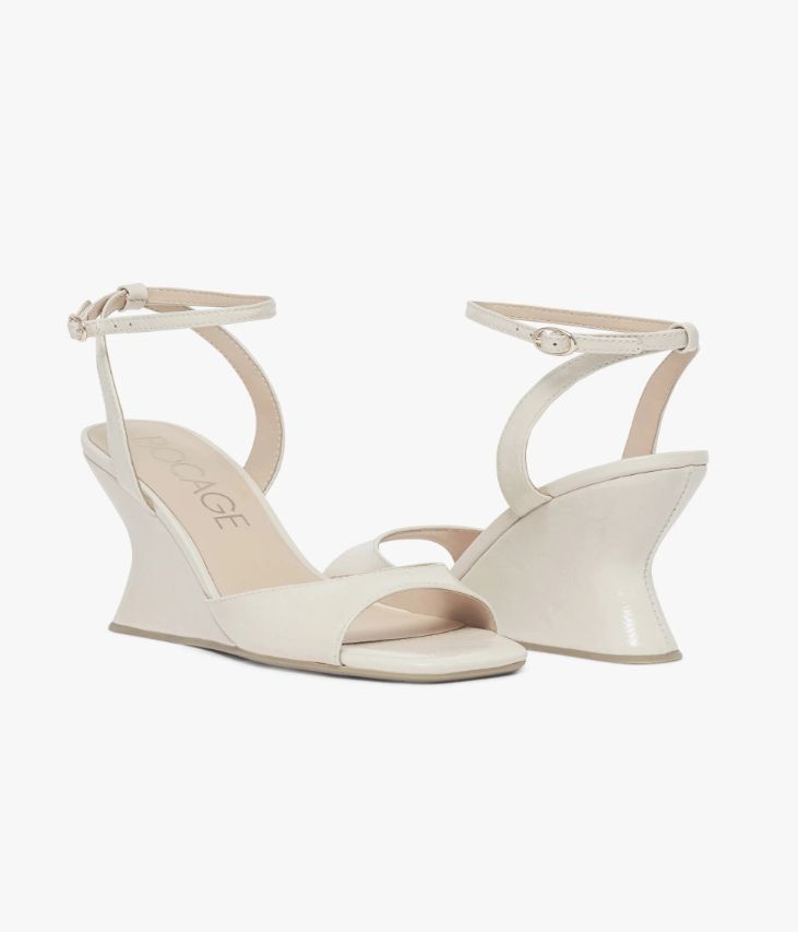 Une sandale en cuir verni blanc cassé fabriquée avec le plus grand soin. Un modèle chic et glamour qui se distingue par sa semelle à bout carré et son élégant talon compensé au design graphique. La bride du dessus est largement échancrée pour mettre le pied en valeur, tandis qu’une fine bride, fermée par une boucle dorée ovale, sublime la cheville. Une chaussure entièrement doublée cuir avec semelle intérieure cuir moussée. Ce cuir Naplak particulièrement souple peut présenter un aspect légèrement froissé.