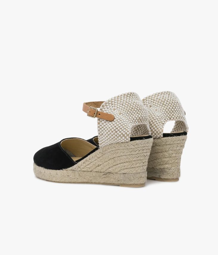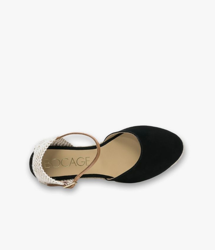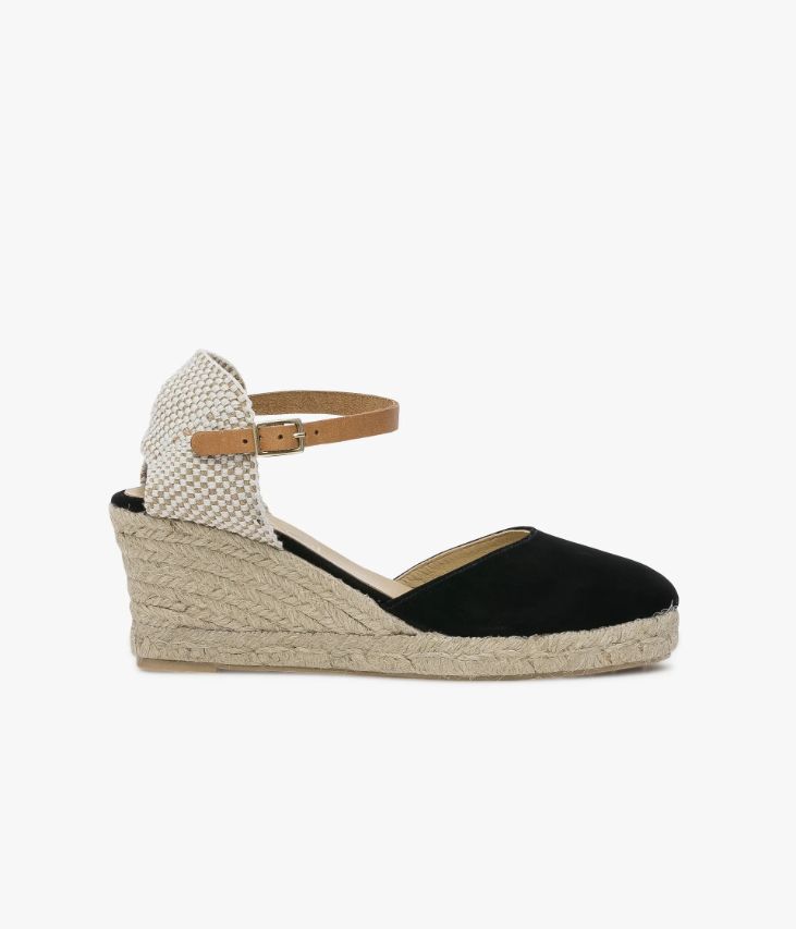 Sandale en cuir velours noir avec semelle compensée en corde. Une sandale noire idéale pour accessoiriser toutes vos tenues du quotidien. Son bout fermé en cuir velours la rend facile à porter dès l’entrée de saison. Le talon en toile tressée beige et écru est légèrement ouvert et la cheville est maintenue par une fine bride en cuir camel qui se ferme par une boucle en métal doré, dissimulant un élastique d'aisance. Cette sandale est montée sur une semelle plateforme de 2 cm avec talon compensé de 7 cm. La semelle et le talon sont recouverts de corde tressée qui renforce l'esprit naturel de cette chaussure. Semelle intérieure cuir. On l’associe avec l'ensemble du dressing estival.