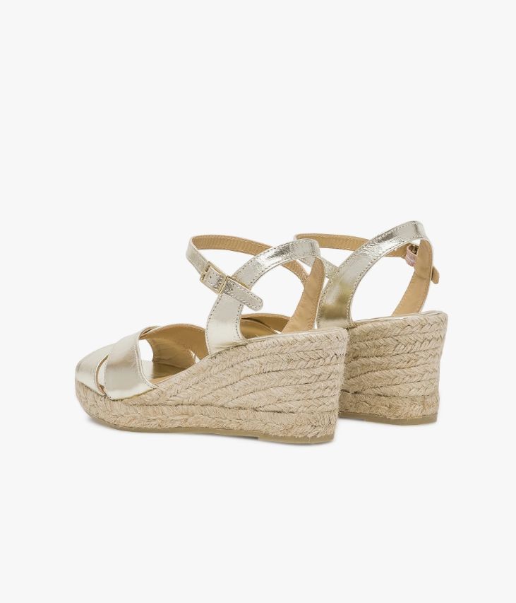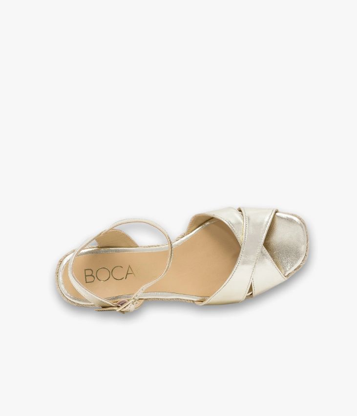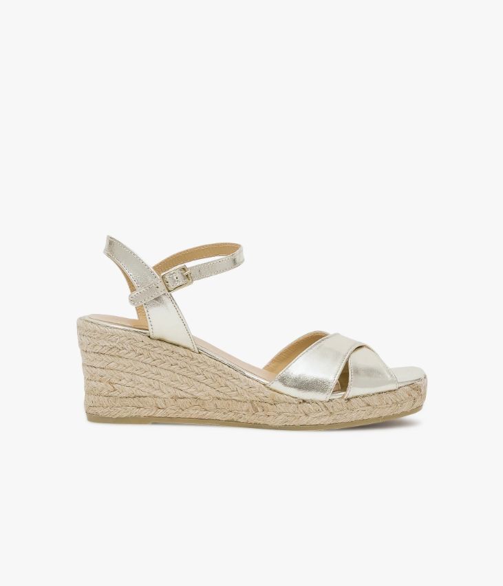 Sandale platine en cuir brillant avec semelle compensée en corde. Cette sandale platine joue sur le mélange des styles avec ses brides en cuir brillant platine et sa semelle compensée en corde inspirée du vestiaire bohème. Une chaussure élégante et scintillante qui illuminera tous vos looks. Les brides croisées sur le dessus assurent un bon maintien du pied, tout comme celles autour de la cheville fermées par une boucle en métal doré dissimulant un élastique d’aisance. Sandale entièrement doublée cuir avec semelle intérieure cuir. Semelle 2 cm. Talon 6,5 cm. On la porte avec une tenue de cérémonie.