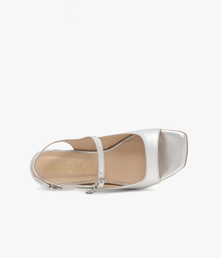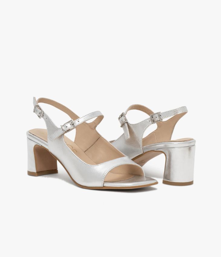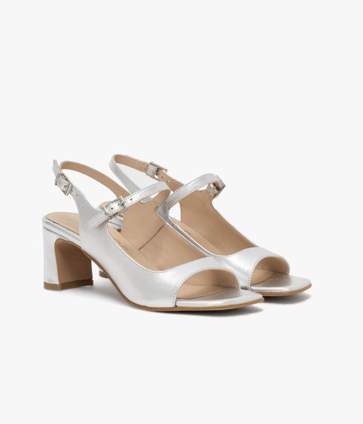 Une sandale en cuir métallisé argent fabriquée avec le plus grand soin. Une sandale rétro dotée d’un large décolleté carré et de deux fines brides ajustables grâce à des boucles métalliques. Elle repose sur une semelle fine à bout carré et un talon à gorge enrobé de cuir. Une chaussure entièrement doublée cuir avec semelle intérieure cuir moussée.