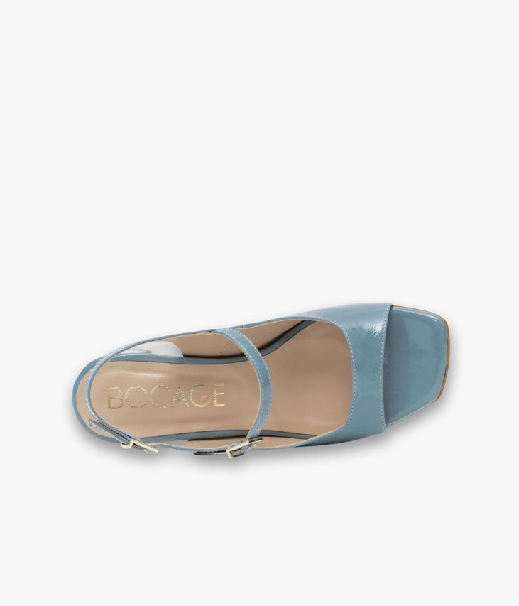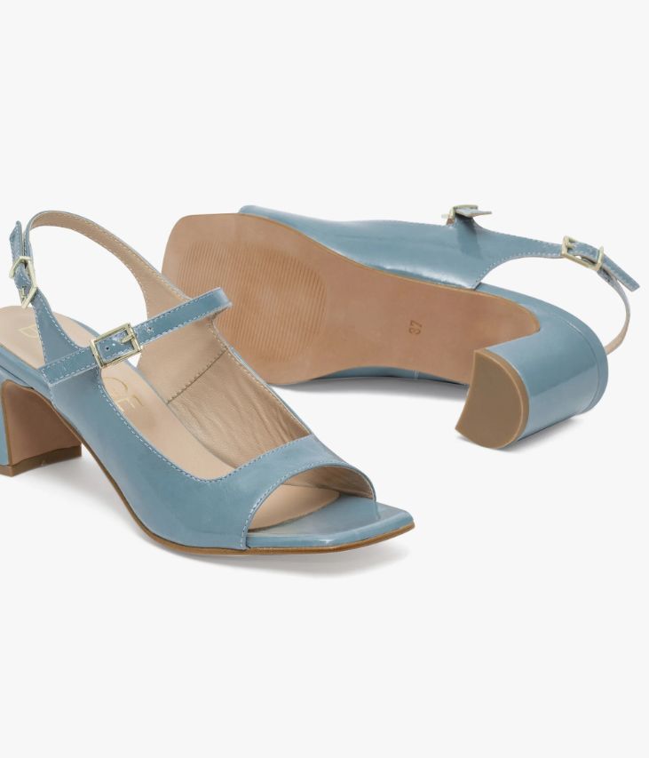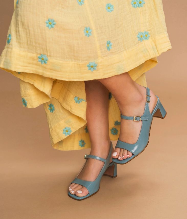 Une sandale en cuir verni bleu fabriquée avec le plus grand soin. Une sandale rétro dotée d’un large décolleté carré et de deux fines brides ajustables grâce à des boucles dorées. Elle repose sur une semelle fine à bout carré et un talon à gorge enrobé de cuir. Une chaussure entièrement doublée cuir avec semelle intérieure cuir moussée. Ce cuir Naplak particulièrement souple peut présenter un aspect légèrement froissé.