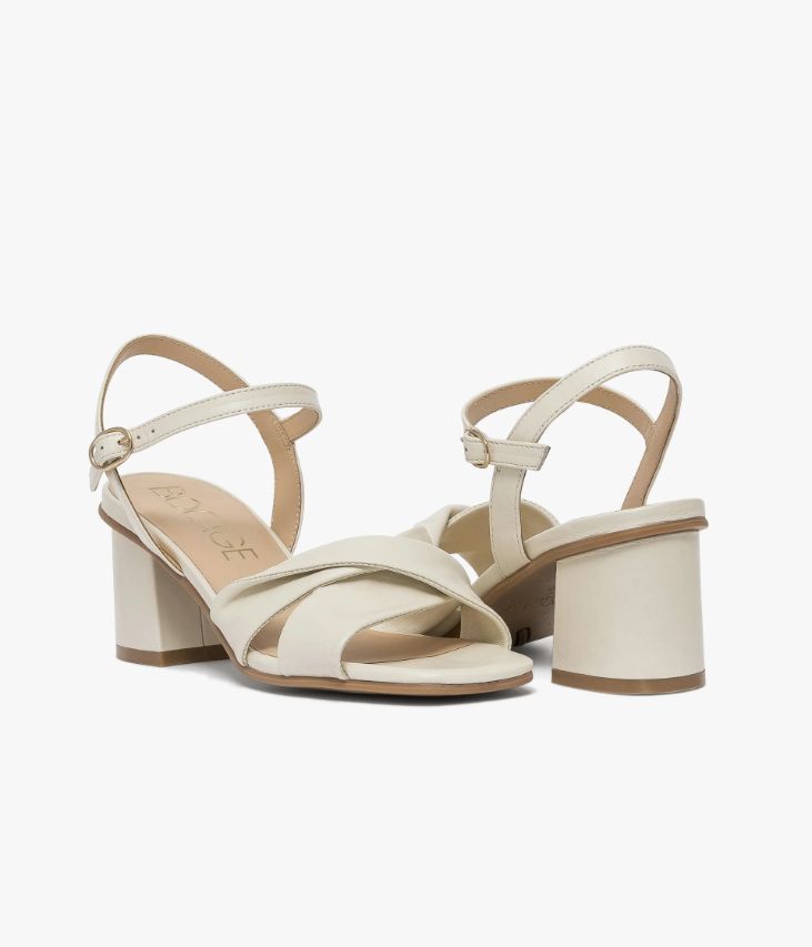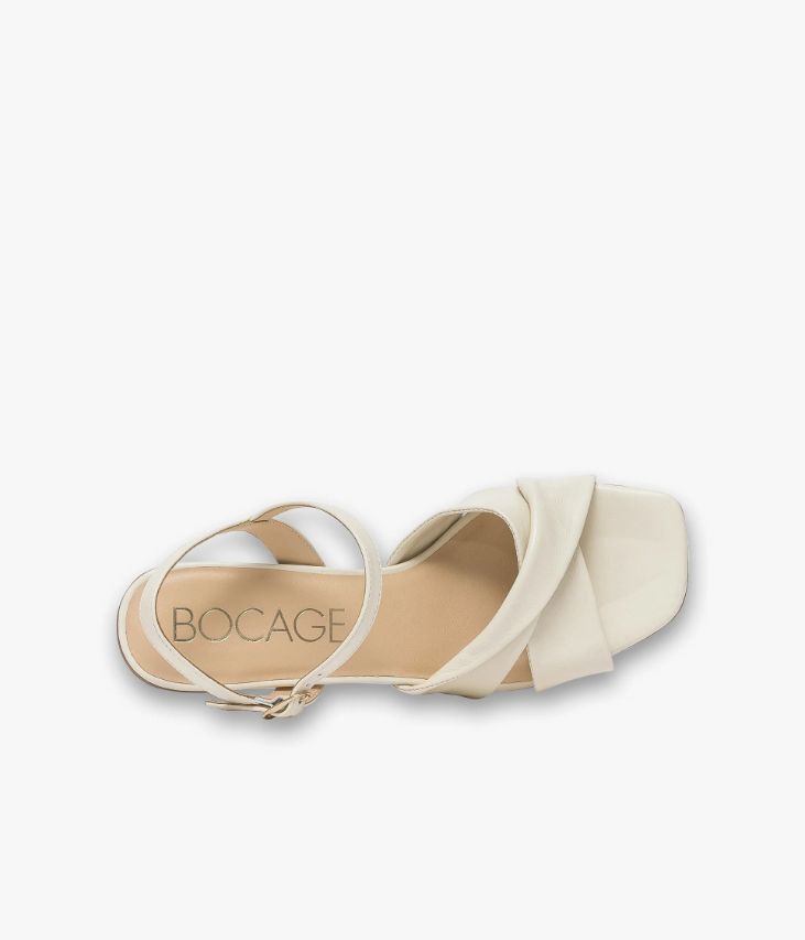 Une sandale écru en cuir lisse fabriquée avec le plus grand soin. Elle allie confort et élégance grâce à ses brides tubulaires ultra souples entrecroisées affichant un effet drapé et ses fines brides autour de la cheville, fermées par une boucle dorée. Elle repose sur une semelle fine et un large talon enrobé positionné en retrait. Notre technologie Bocage Innovation vous garantit un bien-être inégalé. La semelle dissimule des élastiques qui permettent à votre chaussure de s’adapter à votre pied. Une chaussure entièrement doublée cuir avec semelle intérieure cuir dotée d’une fine mousse. Logo signature sous la semelle.