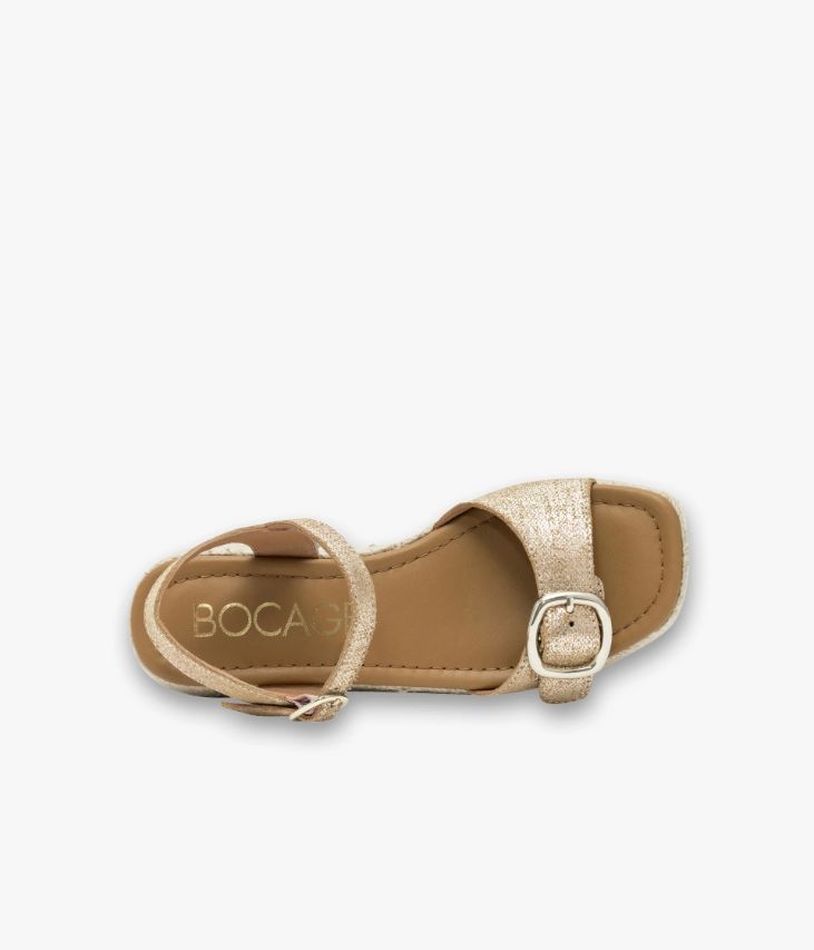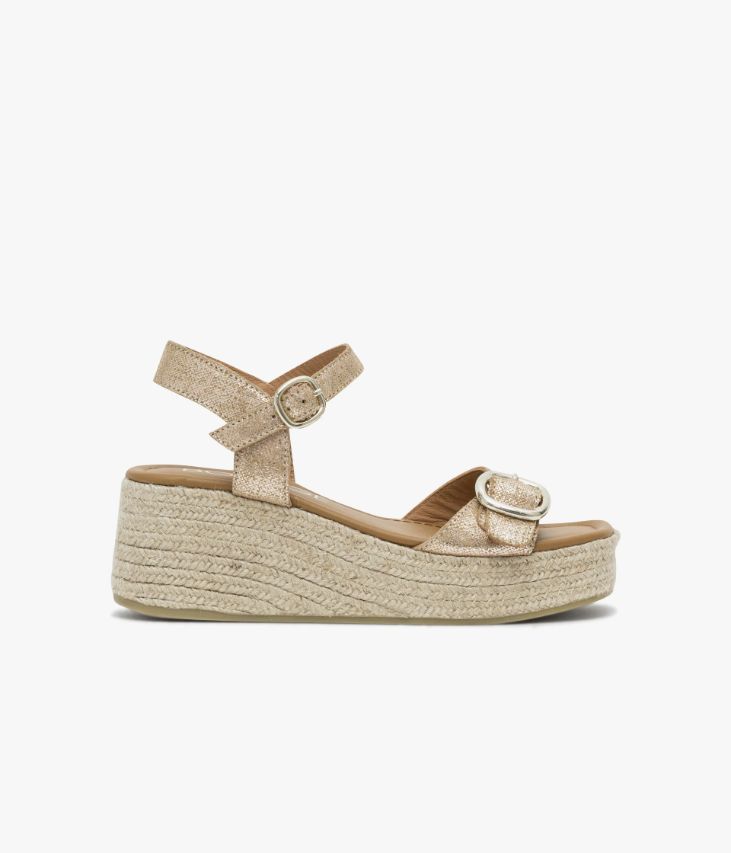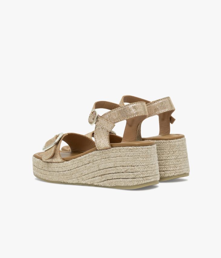 Une sandale en cuir velours métallisé doré fabriquée avec soin en Espagne. Une chaussure dotée de deux brides ajustables à l’aide de boucles dorées sur l’avant du pied et autour de la cheville. Cette chaussure entièrement doublée cuir possède une semelle intérieure cuir dotée d’une fine mousse et repose sur une semelle plateforme en corde tressée avec talon compensé. Elastique d’aisance sous la boucle cheville. Semelle 3 cm.