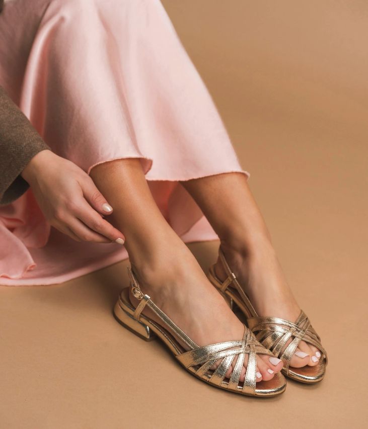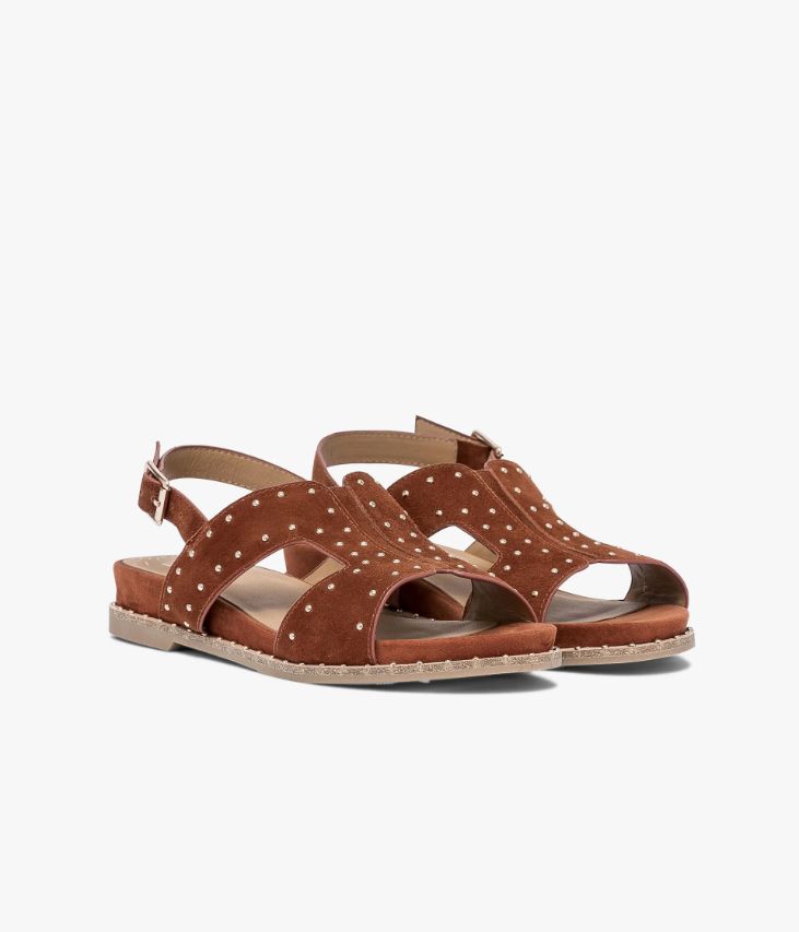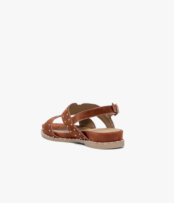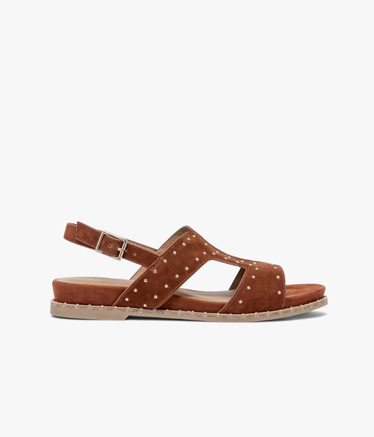 Sandale en cuir velours terracotta avec clous dorés. Une sandale terracotta pleine de douceur avec son dessus en cuir velours. Cette sandale plate offre un bon maintien du pied grâce à son dessus enveloppant ouvert sur les côtés. Sa structure minimaliste est twistée par des petits clous dorés qui ajoutent une touche glamour à la chaussure. Cette sandale est posée sur une semelle souple en caoutchouc ultra confortable avec trépointe cuir ornée de clous dorés. Elle se ferme par une boucle dorée sur le côté. Sandale entièrement doublée cuir avec semelle intérieure cuir. Une sandale à intégrer dans tous les looks bohème. Ce produit est également disponible à la location.