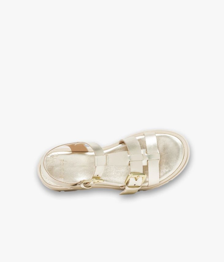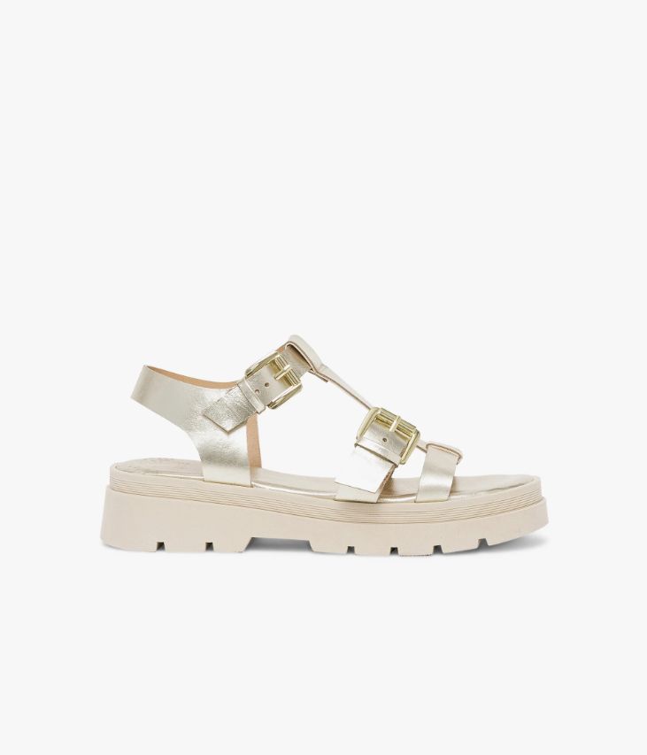 Une sandale dorée en cuir fabriquée avec soin dans notre atelier en Italie. Une chaussure forme Salomé qui offre un parfait maintien grâce à son jeu de brides et s’ajuste par deux boucles dorées. Elle repose sur une épaisse semelle crantée avec semelle intérieure cuir ultra confortable.
