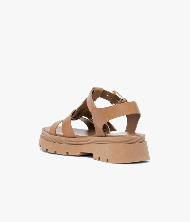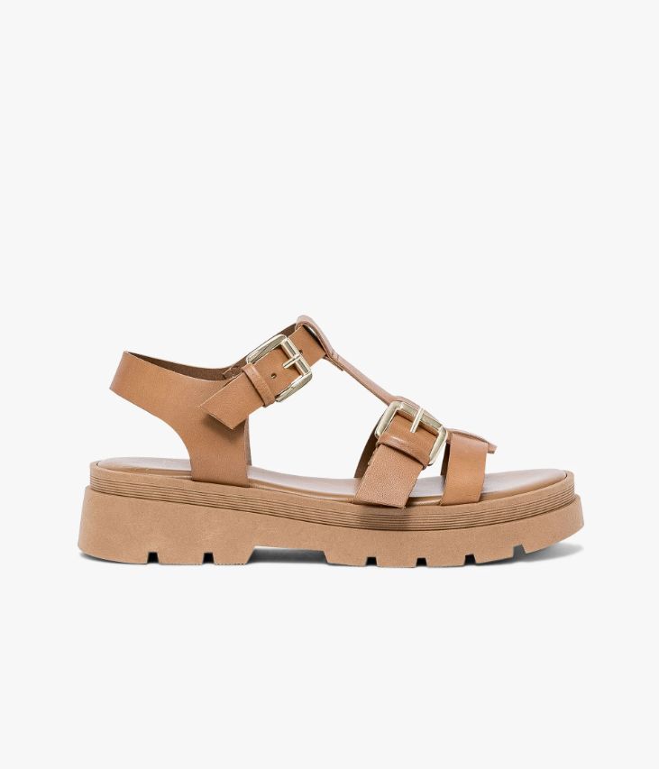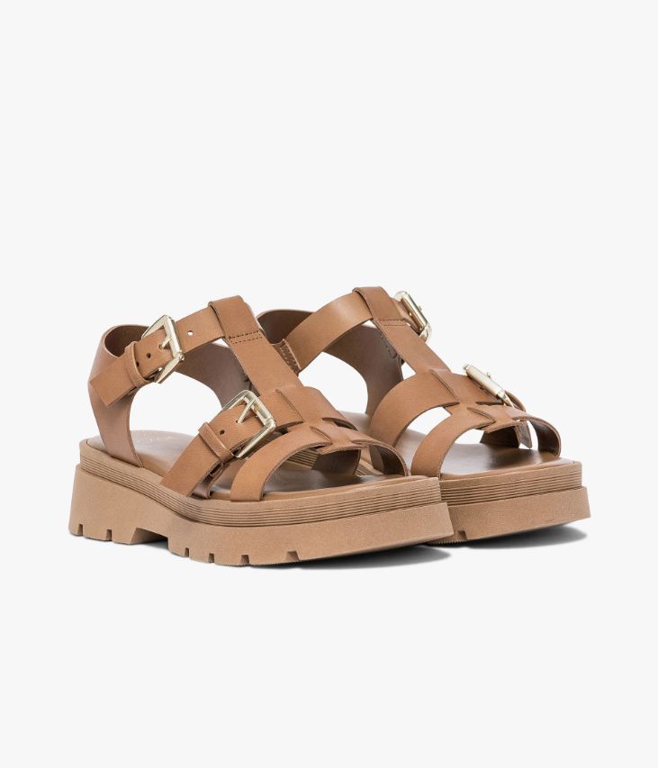 Sandale en cuir cognac sur épaisse semelle crantée. Une sandale cognac en cuir lisse qui vous garantit confort et style toute la saison. Elle allie un dessus au style épuré avec des brides ajustables par boucles en métal doré à une épaisse semelle crantée ton sur ton empruntée aux chaussures de marche. Un nu-pied avec semelle intérieure cuir rembourrée. Talon 4,5 cm. Semelle 3 cm. Une sandale ultra confortable à porter avec l’ensemble du dressing. Ce produit est également disponible à la location.