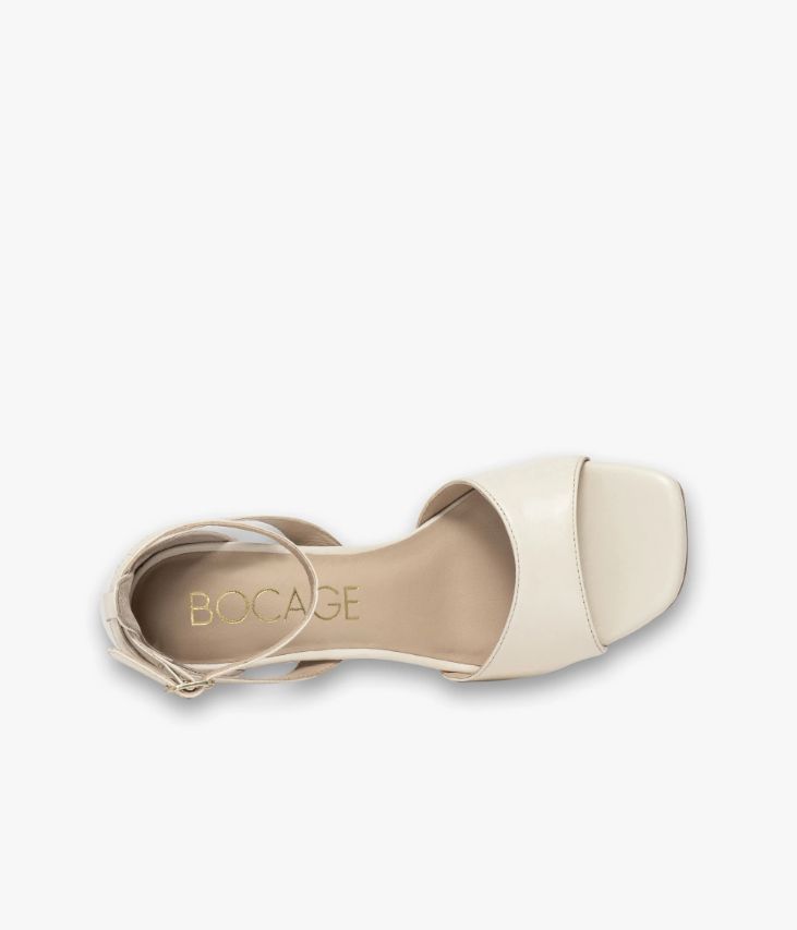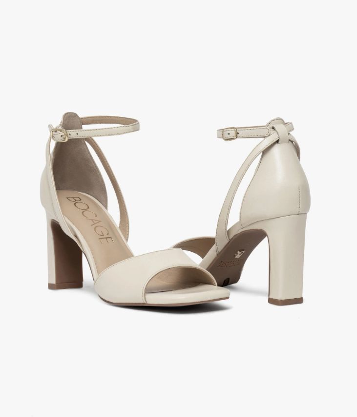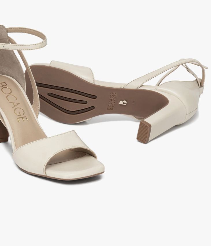 Une sandale blanc cassé en cuir lisse fabriquée avec le plus grand soin. Cette sandale à talon fermé arbore une allure ultra chic avec son jeu de brides à la cheville. La semelle à bout carré et le talon graphique ajoutent à cette chaussure des accents contemporains. Une chaussure entièrement doublée cuir avec semelle intérieure cuir dotée d’une fine mousse. Notre technologie Bocage Innovation vous garantit un bien-être inégalé. La semelle dissimule des élastiques qui permettent à votre chaussure de s’adapter à votre pied.