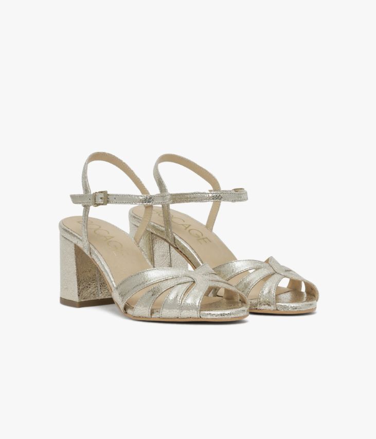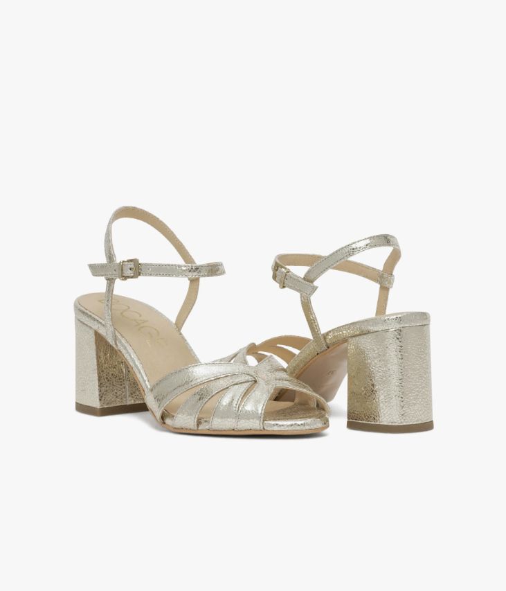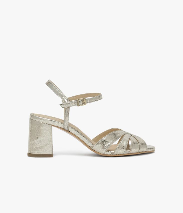 Une sandale platine en cuir métallisé effet craquelé fabriquée avec soin au Portugal. Une sandale chic idéale pour rehausser les looks du quotidien ou ajouter la touche finale à une tenue de cérémonie. Son jeu de brides entrecroisées sur le dessus et sa bride mobile à la cheville offrent un excellent confort. Elle se ferme à l’aide d’une petite boucle carrée en métal doré dissimulant un élastique. Une chaussure entièrement doublée cuir avec semelle intérieure cuir moussée. Elle repose sur une semelle fine et un talon enrobé parfaitement stable.