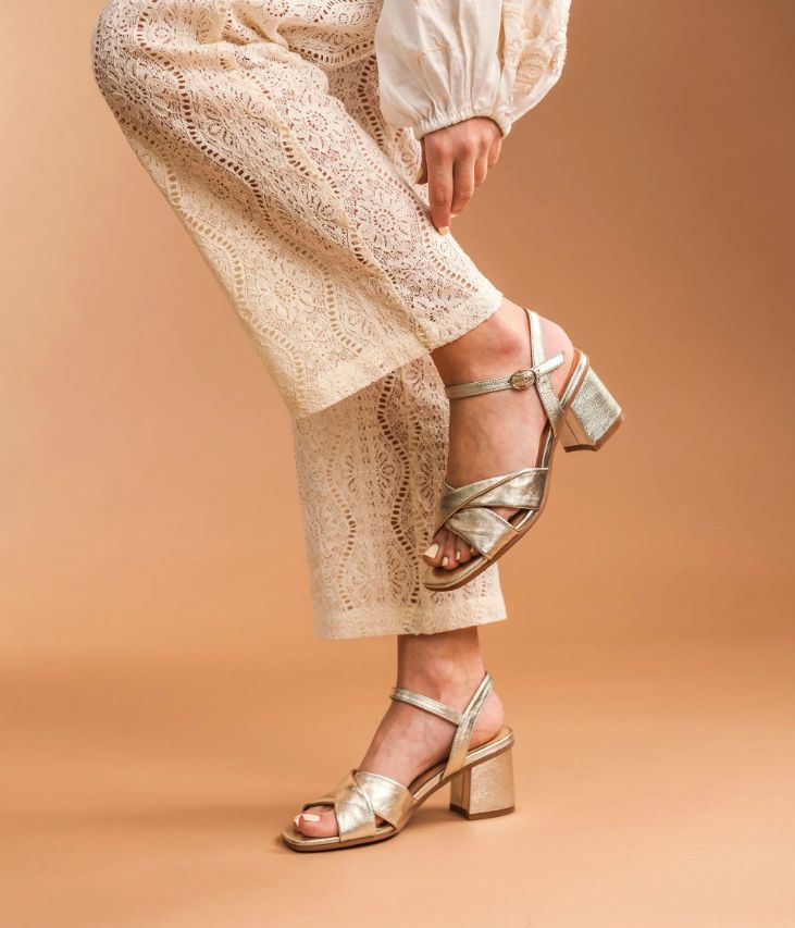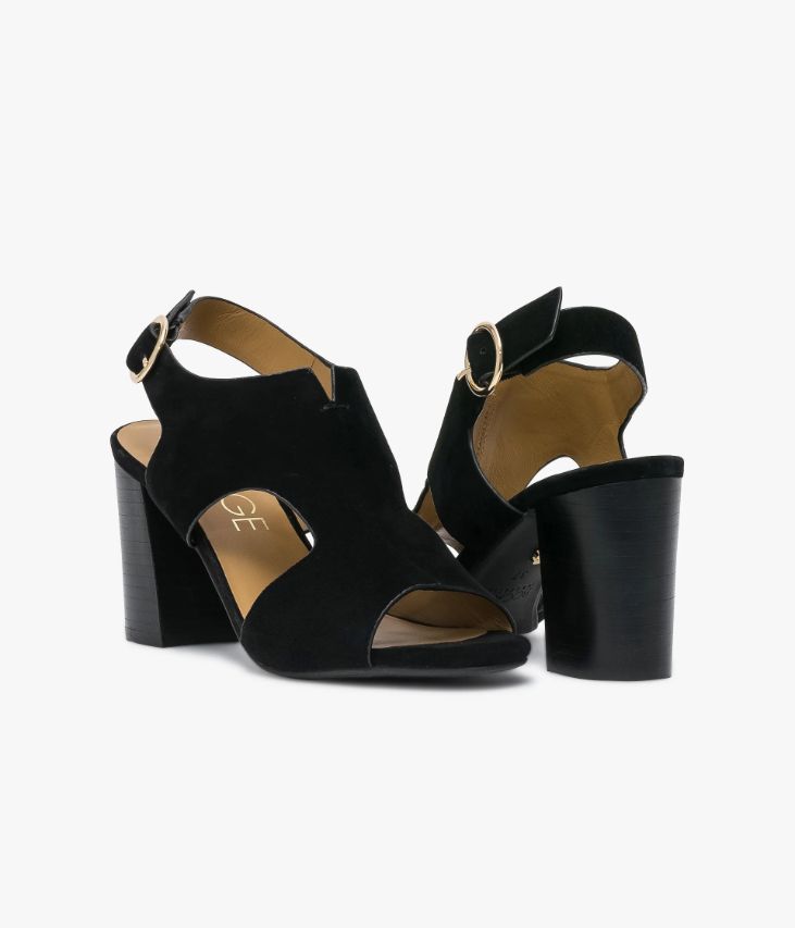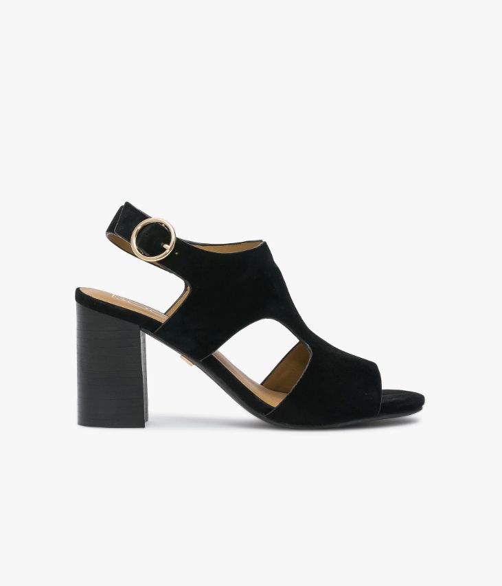 Sandale à talon noir en cuir velours avec dessus enveloppant. Une très jolie sandale noire en cuir velours avec un dessus couvrant qui permet de bien maintenir le pied. Ce dessus est ouvert au bout du pied et sur les côtés, il possède une couture au centre avec une petite découpe en forme de V qui assure beaucoup d'élégance à la chaussure. Cette sandale à talon se ferme sur le côté de la cheville par une jolie boucle ronde en métal doré qui dissimule un élastique d'aisance. Le talon ton sur ton de 7,5 cm assure une bonne stabilité. Cette chaussure possède la technologie brevetée Bocage Innovation, ainsi votre chaussure s'adaptera aux largeurs de votre pied et vous garantira un bien-être inédit. Sandale entièrement doublée cuir avec semelle intérieure cuir. Une sandale noire à porter avec un pantalon 7/8ème écru et un top noir. Ce produit est également disponible à la location.