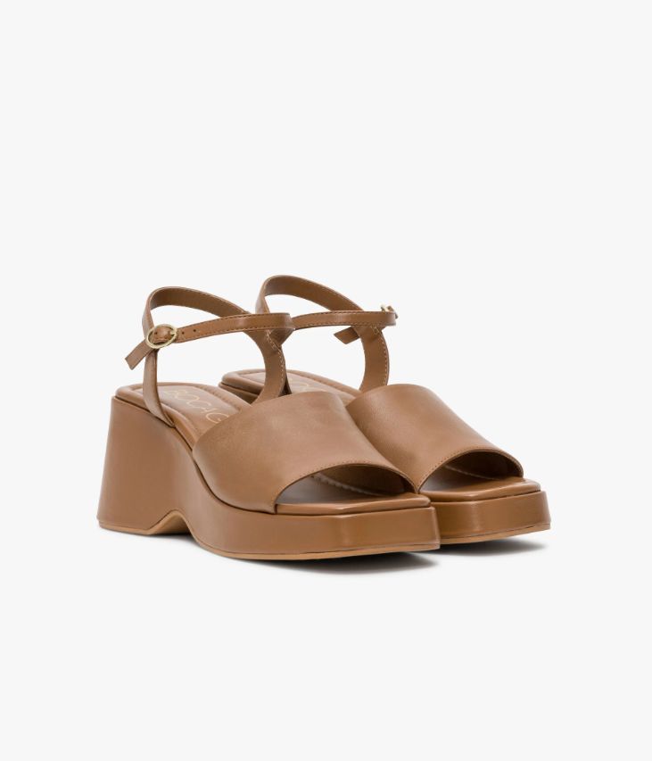 Une sandale en cuir camel fabriquée avec le plus grand soin. Une sandale compensée fortement inspirée des années 90 avec sa semelle plateforme enrobée à bout carré et son imposant talon. Elle joue les contrastes avec une large bride souple sur l’avant et de fines brides autour du talon, fermées par une délicate boucle dorée. Une chaussure non doublée pour offrir plus de confort, avec semelle intérieure cuir dotée d’une fine mousse. Semelle 2 cm.