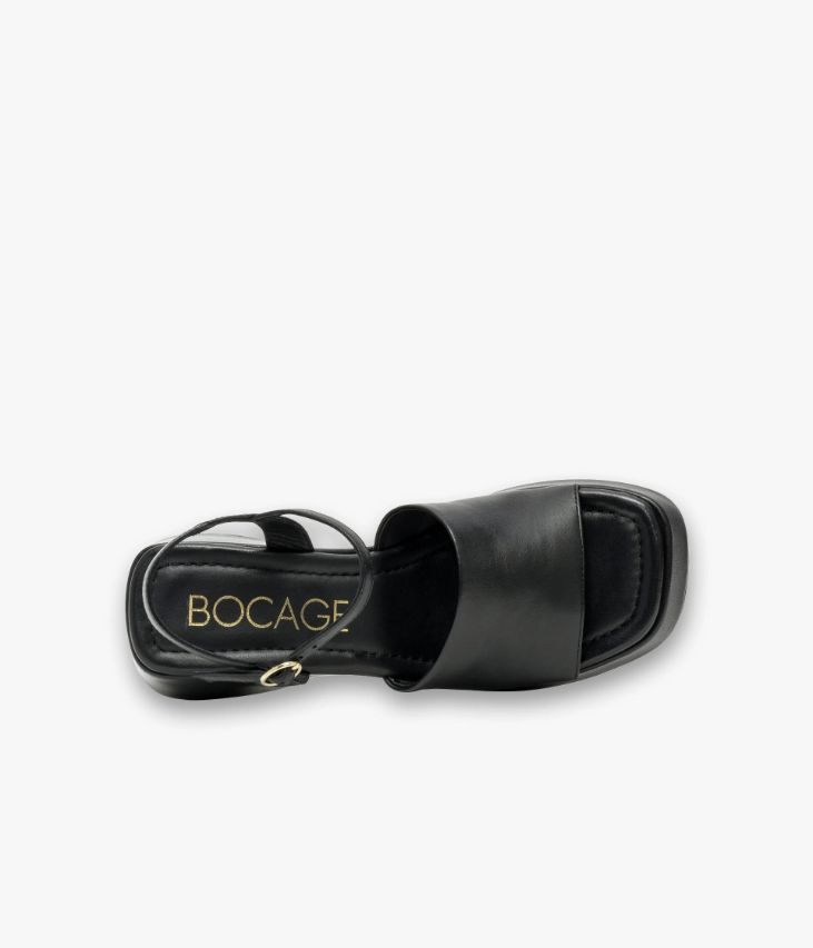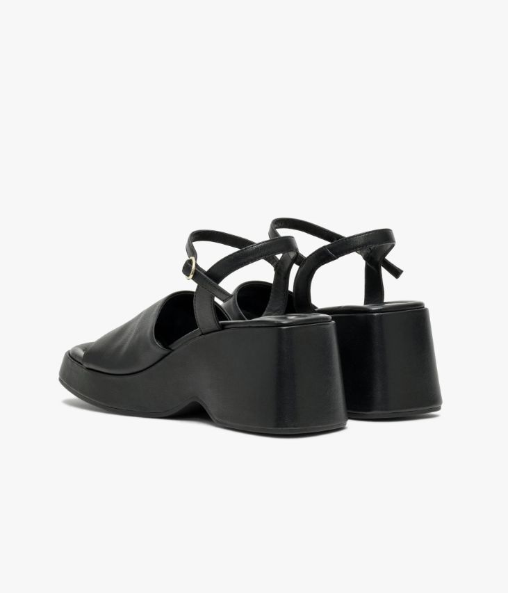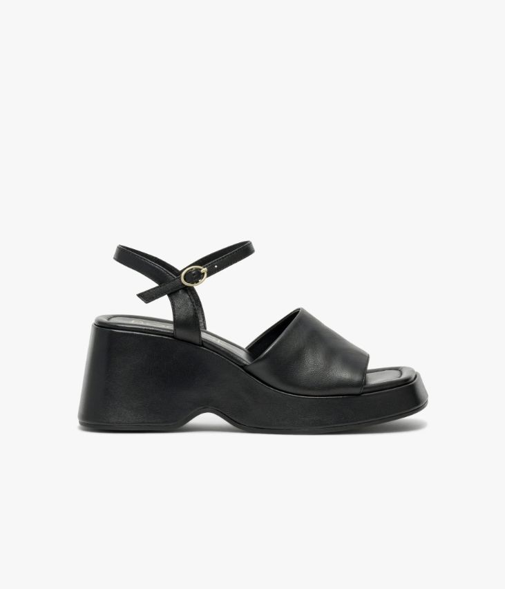 Une sandale en cuir noir fabriquée avec le plus grand soin. Une sandale compensée fortement inspirée des années 90 avec sa semelle plateforme enrobée à bout carré et son imposant talon. Elle joue les contrastes avec une large bride souple sur l’avant et de fines brides autour du talon, fermées par une délicate boucle dorée. Une chaussure non doublée pour offrir plus de confort, avec semelle intérieure cuir dotée d’une fine mousse. Semelle 2 cm.