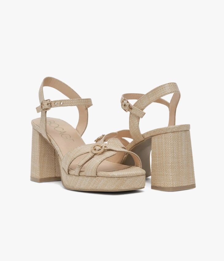 Une sandale en textile effet raphia beige fabriquée avec le plus grand soin. Un modèle doté de larges brides sur l’avant et d’une fine bride à la cheville, toutes deux ajustables grâce à de jolies boucles dorées et de petits œillets métalliques. Une sandale à plateforme enrobée aux accents rétro, avec bout carré et talon bloc de 8 cm. Chaussure doublée cuir avec semelle intérieure cuir dotée d’une fine mousse. Logo signature sous la semelle. Plateforme 2 cm. Elastique d'aisance sous la boucle cheville.