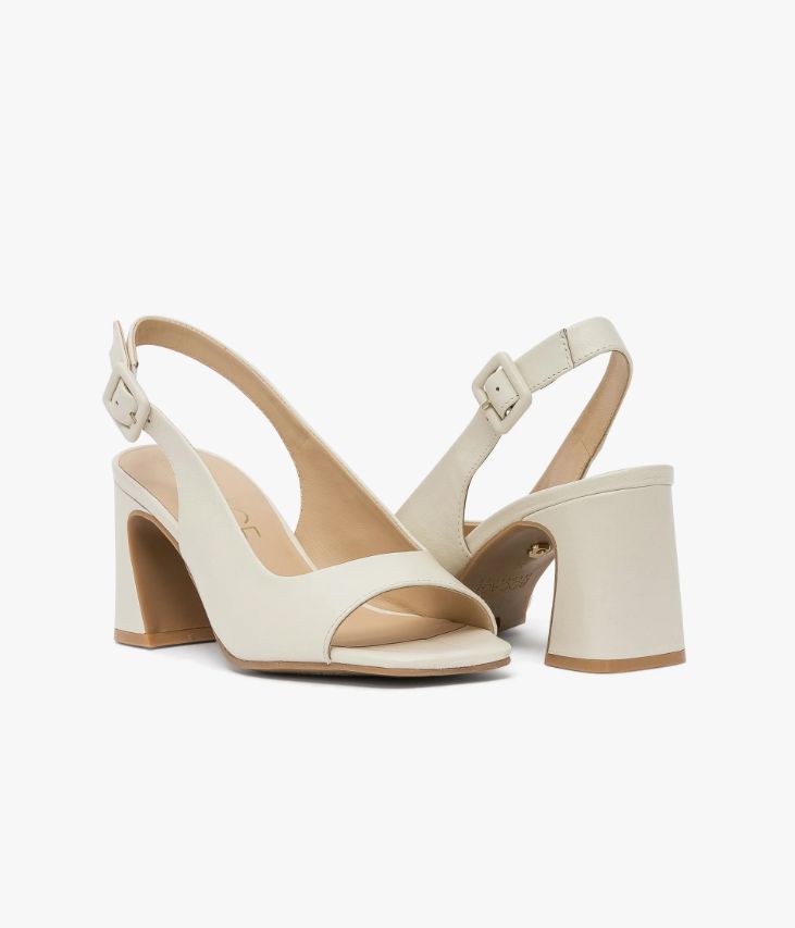 Une sandale en cuir lisse écru fabriquée avec le plus grand soin. Une chaussure rétro avec semelle à bout carré et talon flare enrobé, fermée par une jolie boucle carrée recouverte de cuir. Une chaussure de cérémonie entièrement doublée cuir avec semelle intérieure cuir dotée d’une fine mousse. Notre technologie Bocage Innovation vous garantit un bien-être inégalé. La semelle dissimule des élastiques qui permettent à votre chaussure de s’adapter à votre pied.