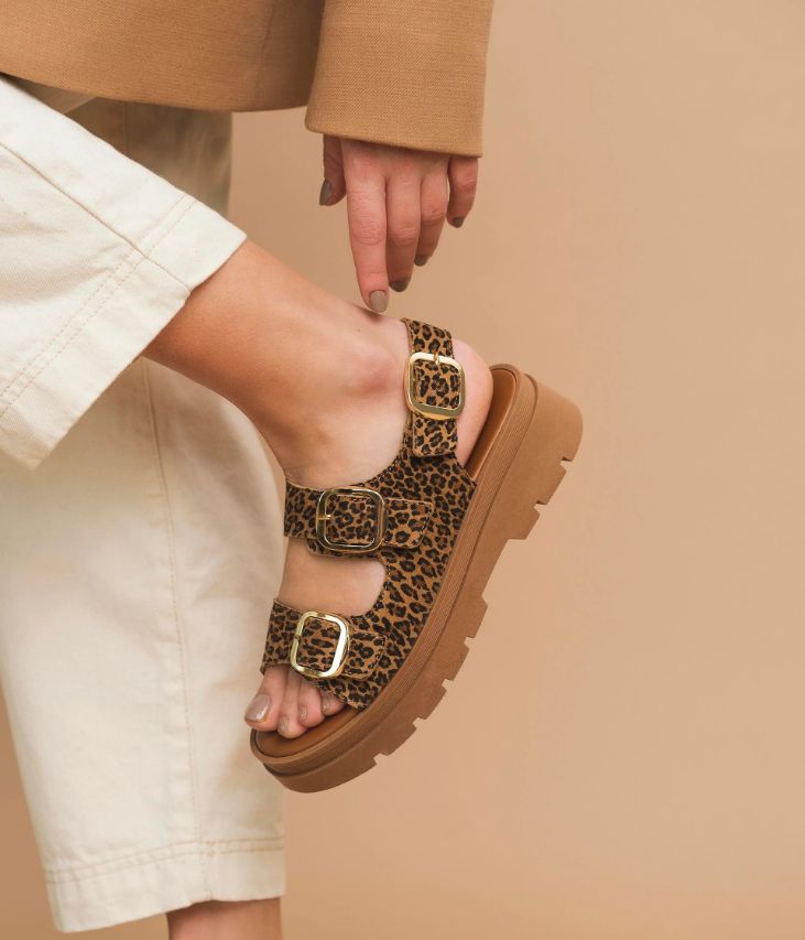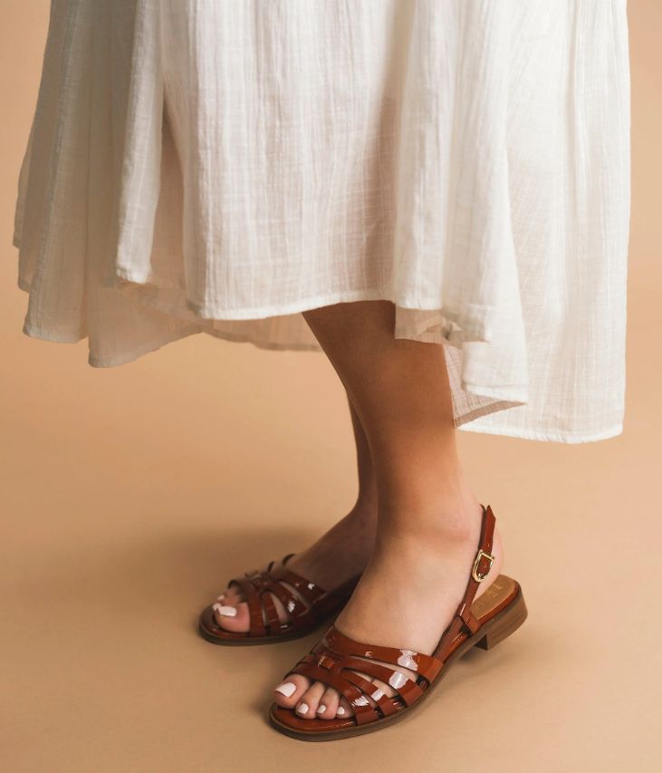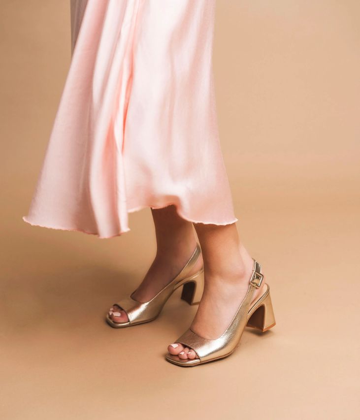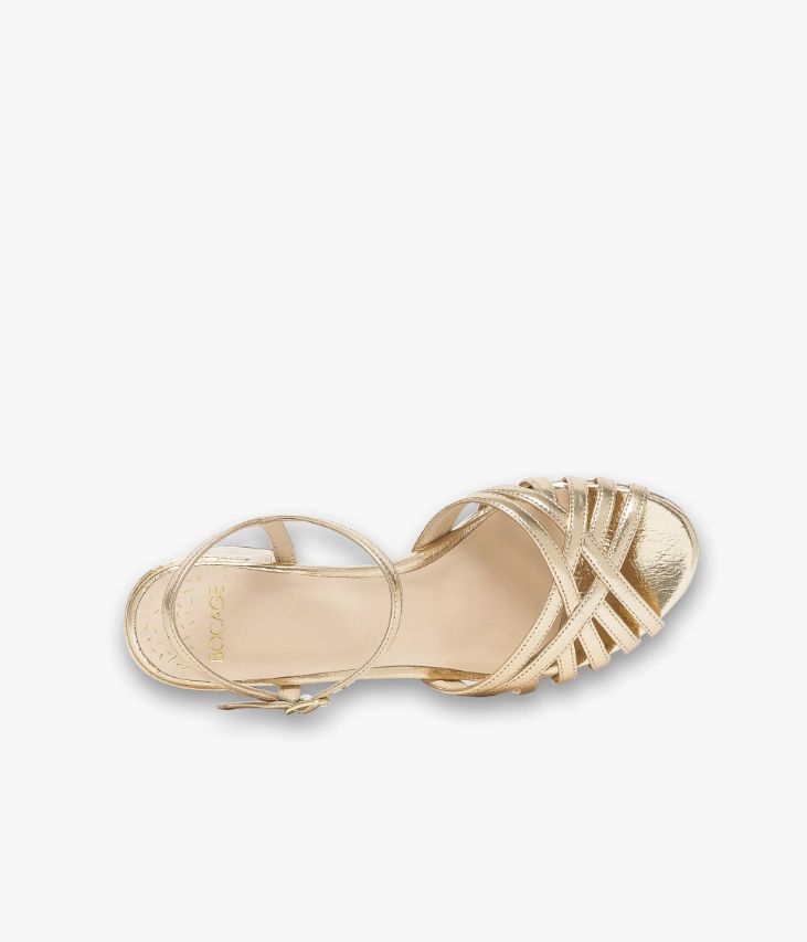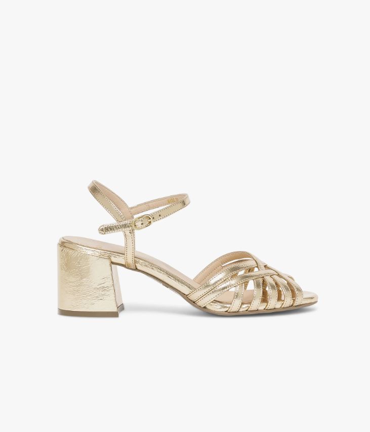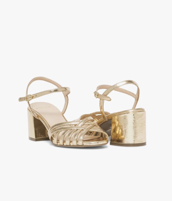 Une sandale en cuir métallisé doré fabriquée avec soin. Ses brides entrecroisées assurent un bon maintien du pied. La bride autour de la cheville se ferme par une fine boucle dorée dissimulant un élastique. Une chaussure scintillante entièrement doublée cuir avec semelle intérieure cuir dotée d’une fine mousse. Elle est posée sur une semelle souple et large talon enrobé.