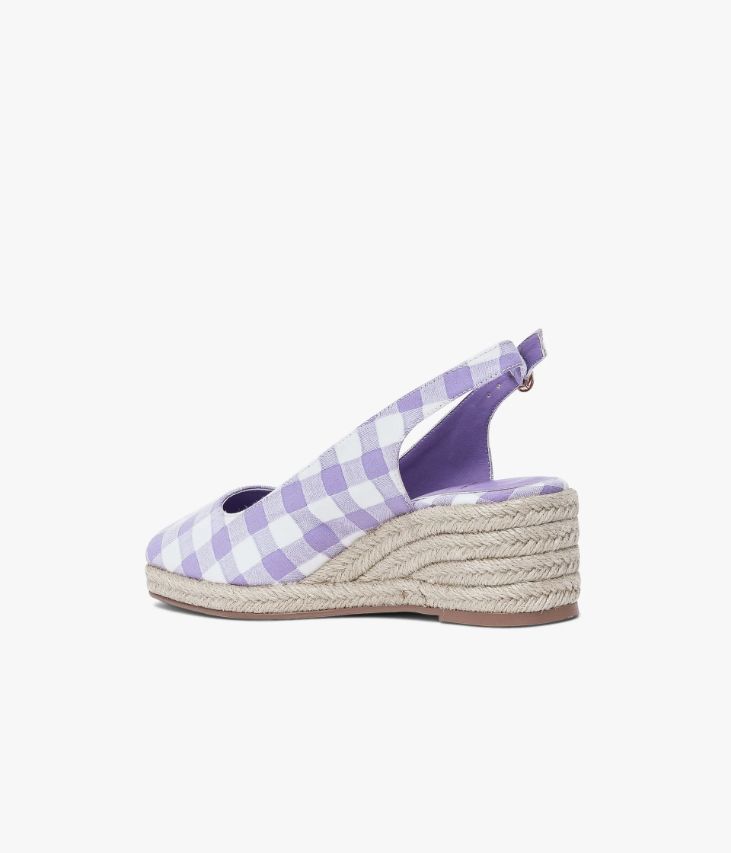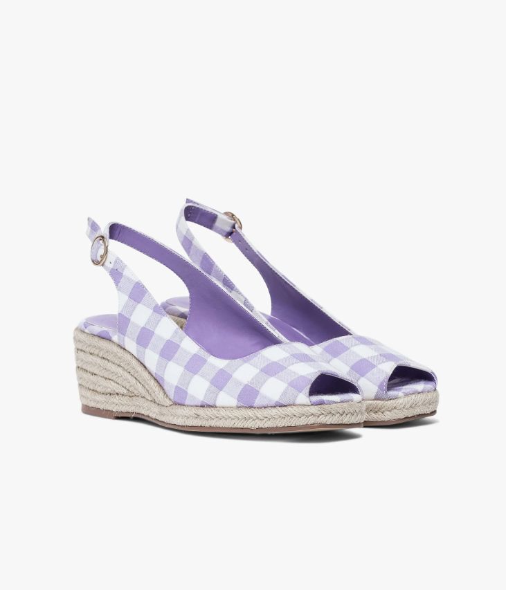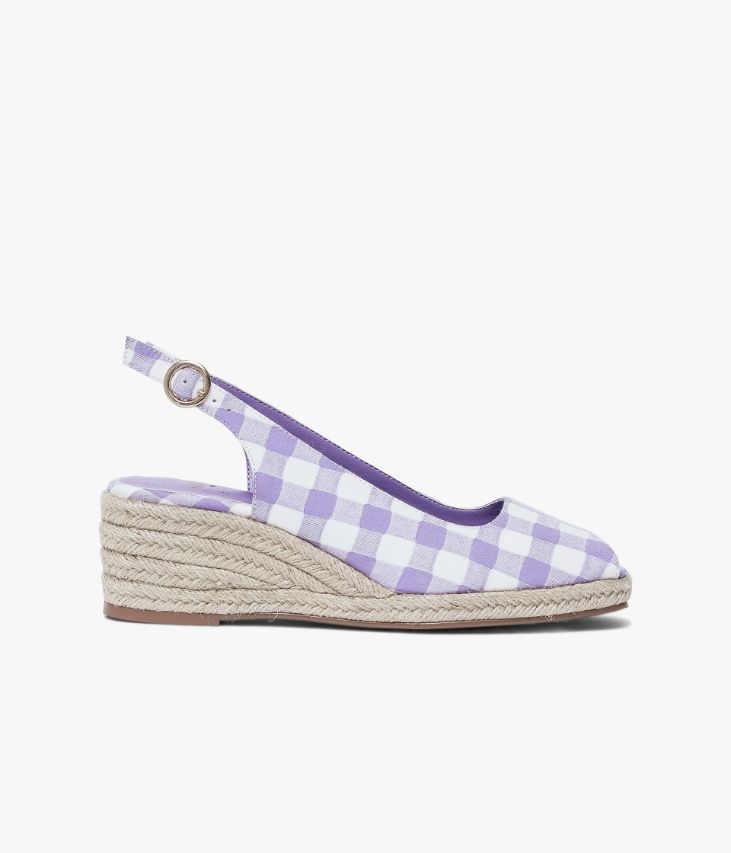 Sandale compensée en toile vichy lilas et blanc Coucou Suzette X Bocage. Une sandale compensée pleine de charme avec son dessus en toile lilas et blanc esprit vichy. Une chaussure ouverte née de la collaboration entre Coucou Suzette et Bocage. Une collection exclusive inspirée par la marque connue pour ses créations colorées, rigolotes, sexy, uniques et délicieusement kitsch ! Ouverte au bout et au talon, cette sandale met le pied en valeur et offre beaucoup de confort grâce à une semelle compensée enrobée de corde à la cambrure idéale. Elle se ferme par une boucle ronde en métal doré. Sandale avec semelle intérieure cuir. Semelle 1,5 cm. Talon 6 cm. Chaussure vegan. Une sandale à porter avec un pantalon blanc et un débardeur lilas. Ce produit est également disponible à la location.