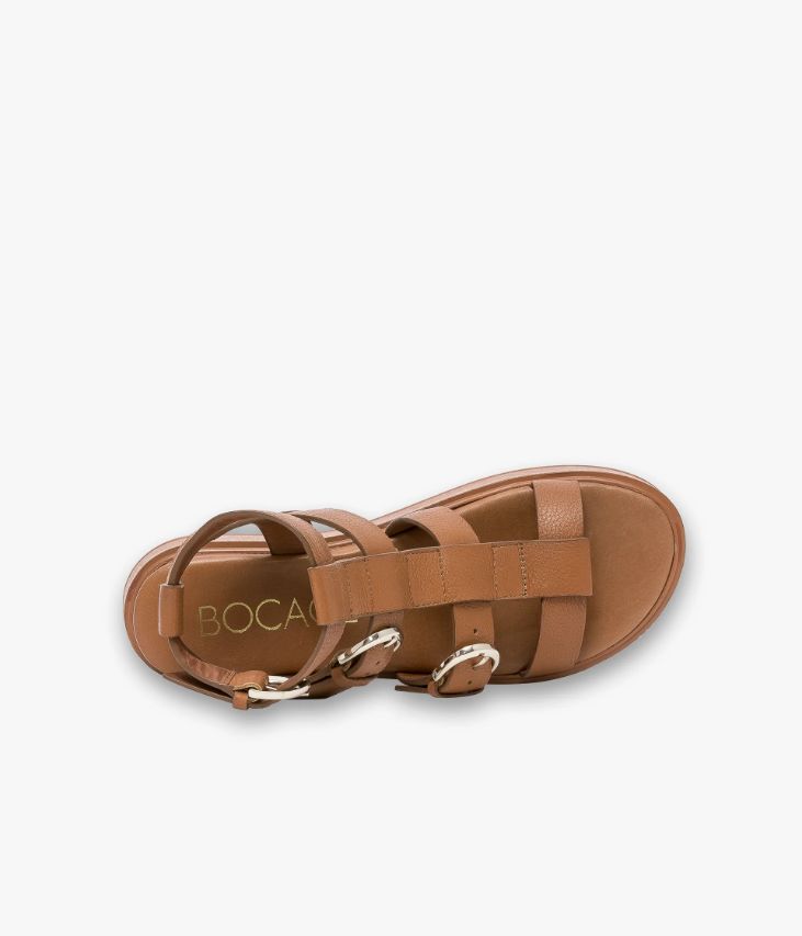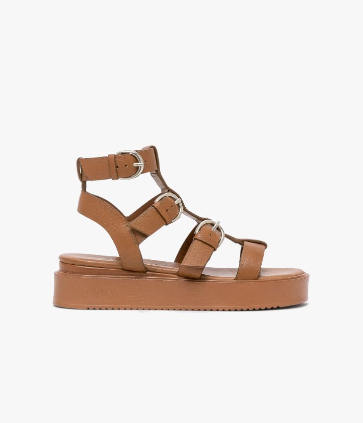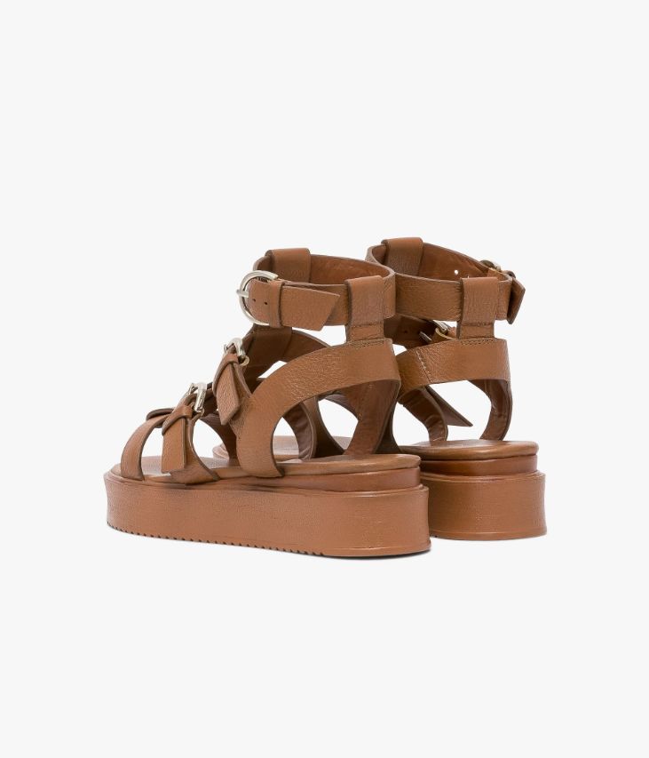 Une sandale cognac en cuir grainé fabriquée avec le plus grand soin. Une chaussure esprit spartiate, à larges brides sur le dessus du pied et autour de la cheville, qui s’ajuste à toutes les morphologies grâce à trois boucles dorées. Une chaussure entièrement doublée cuir avec semelle intérieure cuir dotée d’une fine mousse. Elle est posée sur une semelle plateforme ton sur ton.
