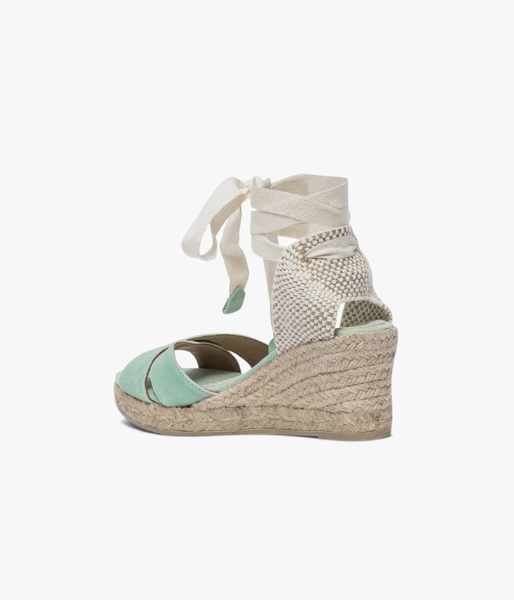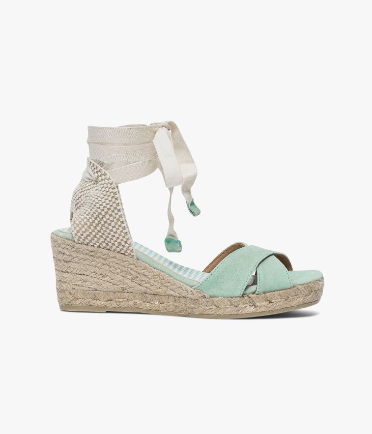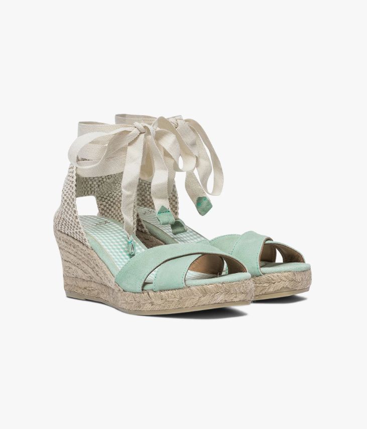 Sandale en cuir velours vert d’eau avec semelle compensée en corde. Une sandale vert d’eau avec brides en cuir velours entrecroisées sur le dessus et talon en toile blanc et beige. Accroché au talon, un ruban en toile avec extrémités en cuir vert s’enroule autour de la cheville. Cette chaussure ouverte est posée sur une épaisse semelle recouverte de corde avec talon compensé. Sandale partiellement doublée cuir avec semelle intérieure cuir. Semelle 2 cm. Talon 7 cm. Une sandale à talon à porter avec une robe fleurie. Ce produit est également disponible à la location.