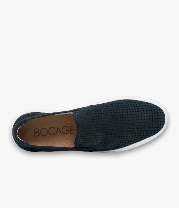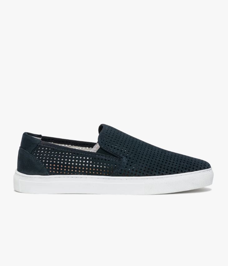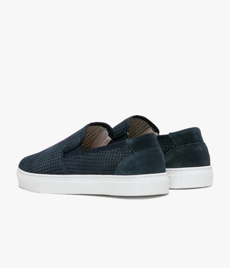 Un slip-on en cuir velours marine fabriqué avec soin au Portugal. Une chaussure ajourée très respirante avec empiècements renforcés au talon. Elle s’enfile facilement grâce à des élastiques d’aisance de chaque côté de la languette. Une chaussure non doublée pour une sensation seconde peau avec semelle intérieure cuir dotée d’une fine mousse. Elle repose sur une semelle blanche. Cette paire bénéficie d’un cousu latéral qui consiste à relier la tige et la semelle. Cette technique apporte une réelle robustesse et souplesse au produit.